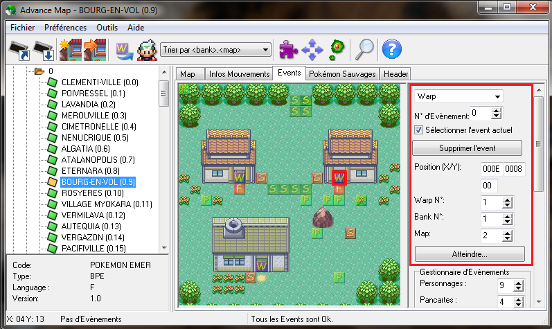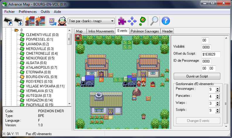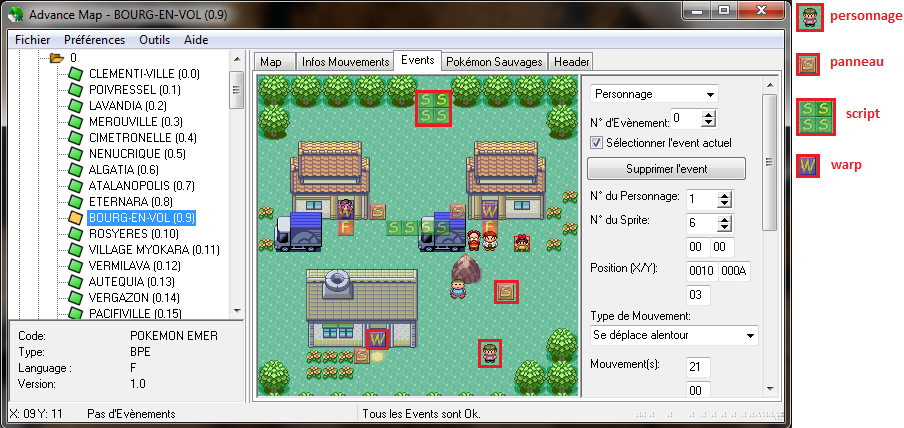 Pour modifier son script (s'il parle, s'il fait quelque chose de spécial), on verra ça un peu plus tard. Pour ajouter des warps, pancartes, etc., c'est la même chose que pour les personnages.On va maintenant apprendre à modifier le , pour qu'il nous emmène là où on veut qu'il nous amène.