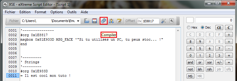 Pour éditer, ou modifier, un texte de personnage, restez dans Advance Map. Cliquez sur un personnage, et sur "Ouvrir un Script" :Cette fenêtre s'ouvre :Pour modifier ce que ce personnage dit, je vais tout d'abord effacer son message :Je vais maintenant écrire autre chose à la place, tout simplement !Quand vous avez fini, cliquez sur le petit dessin représentant deux engrenages, il signifie "compiler" :Cliquez sur "fermer", puis quitter. Ne sauvegardez pas le script. Sauvegardez plutôt votre travail comme d'habitude.