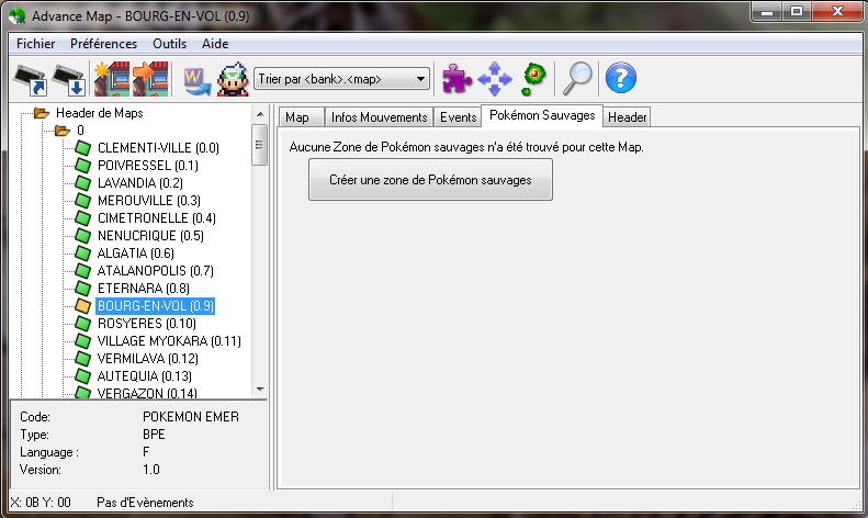 À vous. Sauvegardez les changements si vous le voulez, et vous vous retrouvez à "votre" map. Bien sûr, si je veux pouvoir retourner à Bourg-en-Vol, je dois tout refaire en sens inverse, c'est logique. : Lorsque vous faites des changements dans le jeu, n'oubliez pas de votre travail !Vous savez modifier les warps !On vient de conclure une grosse partie de votre apprentissage. Pfiou !On va maintenant s'intéresser aux Pokémon sauvages. Eh oui, vous pouvez même ajouter une zone de capture, ou modifier les Pokémon s'y trouvant !Cliquez sur l'onglet "Pokémon sauvages" :Cliquez sur "Créer une zone de Pokémon sauvages" (il faudra au préalable ajouter des hautes herbes et/ou un point d'eau).