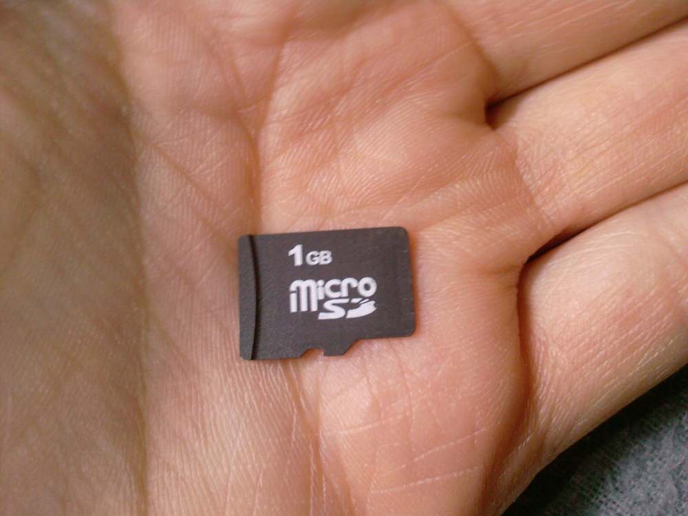 On voit une fente noire. C'est là qu'on met la mémoire. Voici le genre de mémoire qu'on utilise. C'est de la mémoire Micro SD :